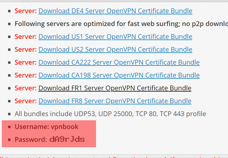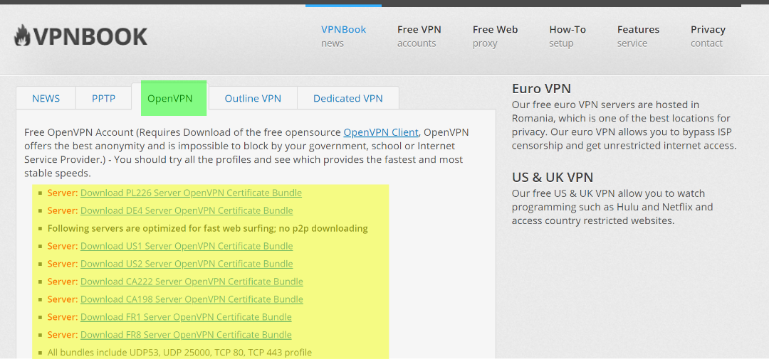2. Sonra https://www.vpnbook.com adresine gidin ve ortada bulunan OpenVPN sekmesine tıklayın (yeşil işaretli), ve sarı işaretli yerdeki sunuculardan birine tıklayarak sertifikayı indirin. Sayfayı kapatmayın bir kaç adım sonra ihtiyacımız olacak.
