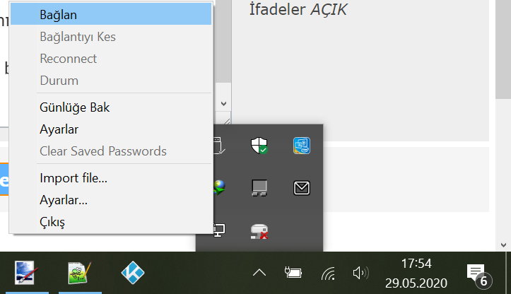 9. Yine openVPN programının (sistem barında açık bulunan) üzerine gelip farenin sağ tuşu ile tıklayın, çıkan menuden "Bağlan" ı seçin,